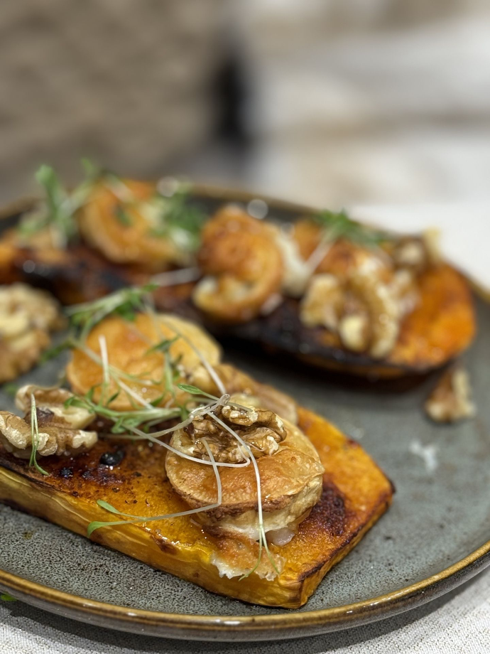 Le *toast* de butternut, chèvre chaud, miel et noix, étant des tranches de butternut poêlées et caramélisées permet l'originalité et la possibilité d'être adapté selon les choix alimentaires de chacun.